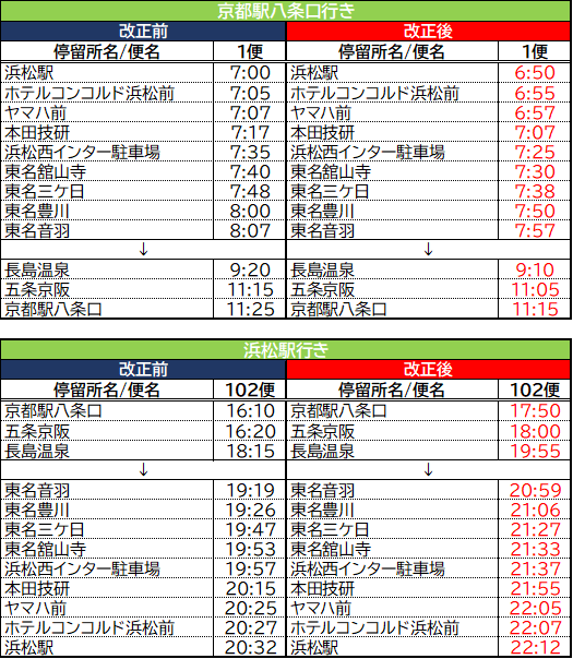 (改正前) 浜松駅 7:00発 ➡ 長島温泉 9:20着 ➡ 京都駅八条口 11:25着